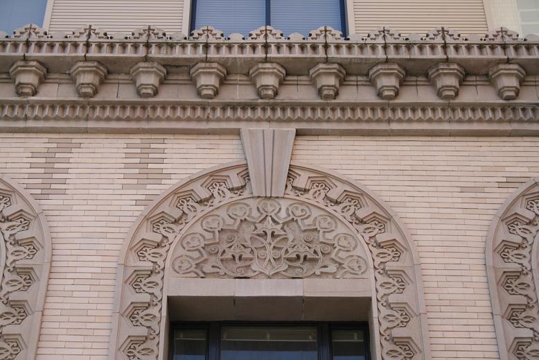 大阪農工銀行 辰野片岡建築事務所が設計した銀行建築を、約10年後に國枝博が全面的な改修設計を施した。現在はアパレル企業の本社として活用されている。國枝博はアール・デコの繊細で華やかな装飾を得意とした建築家で、この建築もアラベスク文様の華麗なテラコッタで全体が覆われている。実は建物西側の外壁だけは改修されておらず、ビルの隙間から覗くと辰野が得意とした赤レンガの壁をみることができる。