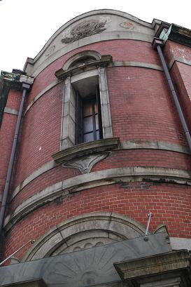 大阪教育生命保険 赤レンガの壁面に白いストライプが幾重にも巡る、辰野デザインの特徴がよくでた建築。当時は玄関のある角の屋根に、とんがり帽子の塔が載っていた。これも辰野がよく好んでつかったデザインだ。元々は保険会社の社屋として建てられたが、現在は大きな改修工事が加えられて、本格的なフレンチレストランのグランメゾンとして活用されている。