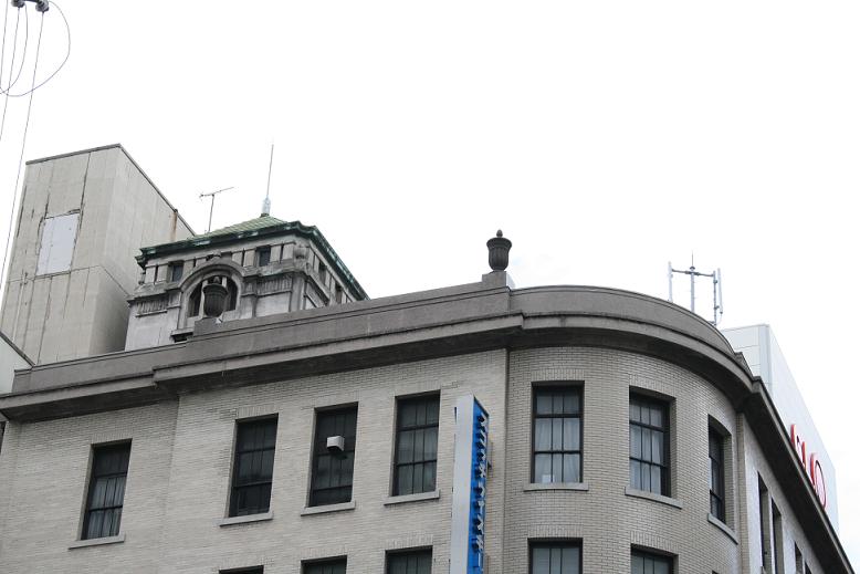 明治屋南本町ビル 高級食料品を扱う明治屋のビルとして、かつて1階に店舗を構えていた。あっさりした印象の外壁だが、竣工当時の写真をみるとセセッション風のパターンや付け柱などで飾られていたのが確認できる。堺筋から見上げたのではわかりにくいが、屋上の塔屋部分には改修前の雰囲気がよく残っている。