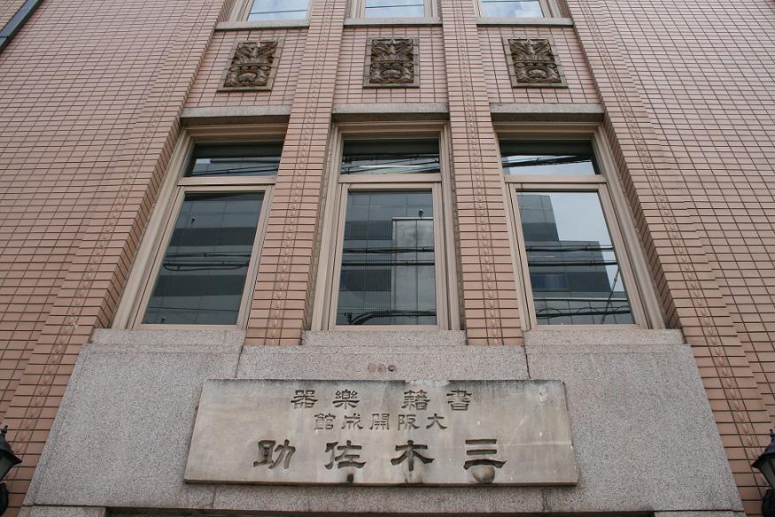 大阪開成館三木佐助商店 総合楽器店として知られる三木楽器は1925年に「河内屋佐助」として創業、四代目三木佐助の頃から楽器を取り扱うようになり、現本社のこのビルを建てた。現在は本社機能の他に「開成館」として、ピアノに特化したサロンがある。玄関のステンドグラスや優雅な装飾で飾られた階段など、当時の状態をよく残している。外装のタイルは1989年の改修時に貼り直した新しいものだが、信楽で焼いた特注タイルを使うなど、オリジナルの雰囲気を伝える改修が行われた。