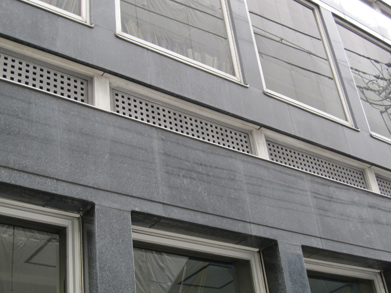 ?森田紡績の大阪営業所と兼ねたテナントビルとして、村野藤吾設計により設計されたビル。 街中でもひときわ目を引く、黒く輝く御影石の外観。ビルに近づけば近づくほどその重厚感に圧倒される。 各階層に水平に走るアルミパンチンググリルや一階腰壁部分の金属板が、重たさを感じさせる御影石の外観にバランスよく軽やかさを加えている。こんなビルに事務所を持っていたらカッコイイですねぇ。 内部は改装されたものの、柔らかい曲線の階段手摺や天井照明などが当時のデザインのまま残されているそうです。森田ビルディングHPで詳しく見ることができます。文化勲章受賞。