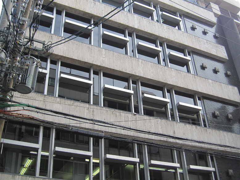 厚みをもたせた大きさの異なる長方形板を上手くデザインに取り込んだ、素敵で重厚感のある外観。 特に一つ一つの窓から突き出た庇のデザインには驚かされる。タイル貼りの外壁やガラス窓、外壁に貼り付けられた水平方向を強調するコンクリートの長方形板など、それぞれの位置や占める割合のバランスがいいのか!?一つの作品と言っていいほどクオリティの高いビルである。
